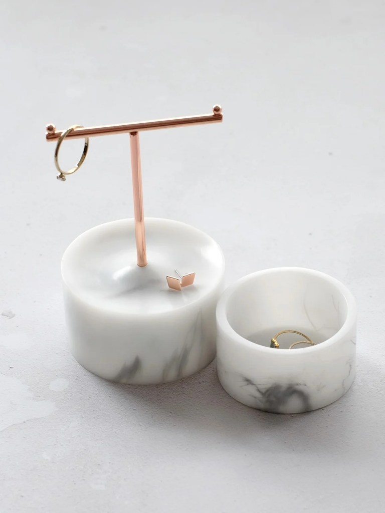 This T bar hanger with a marble effect base is the perfect place to store and display all of your small jewellery items. There is also a hidden compartment in the base of the stand, which can be used for additional storage.