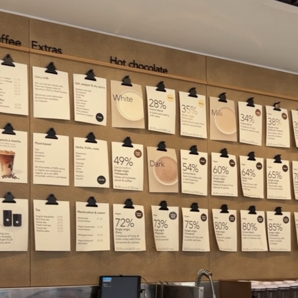 The Knoops concept is simply based around their carefully curated percentage menu which offers chocolates to suit every taste and mood – from 28% White Chocolate, to 100% Rich Dark Chocolate.