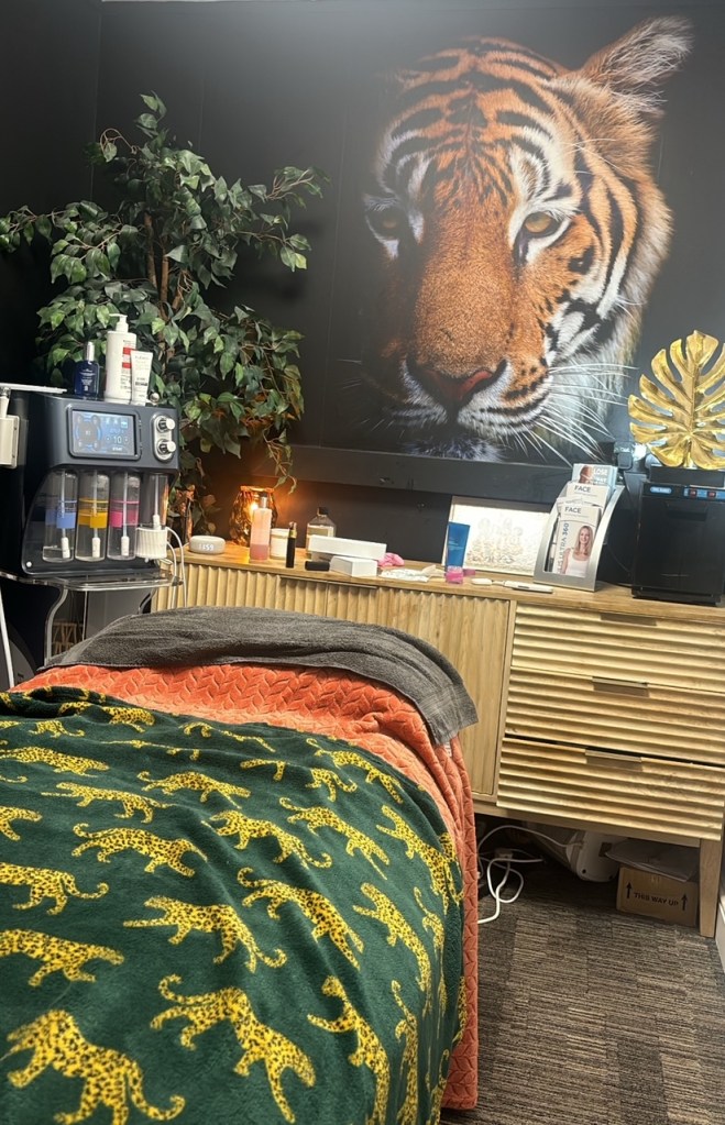 I absolutely adored the exotic theme of the room – a large tiger mural on the wall and wooden furniture with gold items adorning the shelves – really helped transport me away for my treatment.